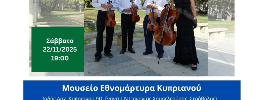 Συναυλία με το κουαρτέτο εγχόρδων Arte y Musica Quartet, 22/11/25, με τη στήριξη του Δήμου Στροβόλου – Μουσείο Εθν. Κυπριανού