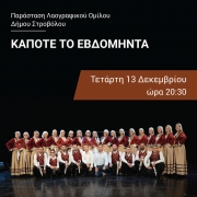 | 27/9/2023 | 20:30 | Μουσική παράσταση «Ένα τραγούδι μια ευχή», 27/9/23 | Ο Σύνδεσμος «Ένα όνειρο μια ευχή» παρουσιάζει τη μουσική παράσταση «Ένα τραγούδι μια ευχή»
