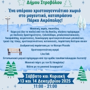 Ένα υπέροχο χριστουγεννιάτικο χωριό θα στηθεί στο μαγευτικό, καταπράσινο Πάρκο Ακρόπολης το Σαββατοκύριακο 13 και 14/12/25, για να φιλοξενήσει το Χριστουγεννιάτικο Φεστιβάλ του Δήμου Στροβόλου!