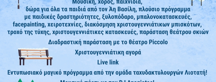 Κοπιάστε στο Πάρκο Ακρόπολης για να ένα διήμερο γεμάτο με τη μαγεία των Χριστουγέννων,  για να απολαύσετε χριστουγεννιάτικες μελωδίες, να ψωνίσετε στη χριστουγεννιάτικη αγορά, να δοκιμάσετε ζεστά εδέσματα και γλυκά, να διασκεδάσουν οι μικροί μας φίλοι με άφθονες παιδικές δραστηριότητες και να επιβιβαστείτε στο μουσικό λεωφορείο για βόλτες στον Στρόβολο το απόγευμα του Σαββάτου και της Κυριακής, με ζωντανή μουσική από τη Συμφωνική Μπάντα Δήμου Στροβόλου – Ευρωπαϊκού Πανεπιστημίου Κύπρου!