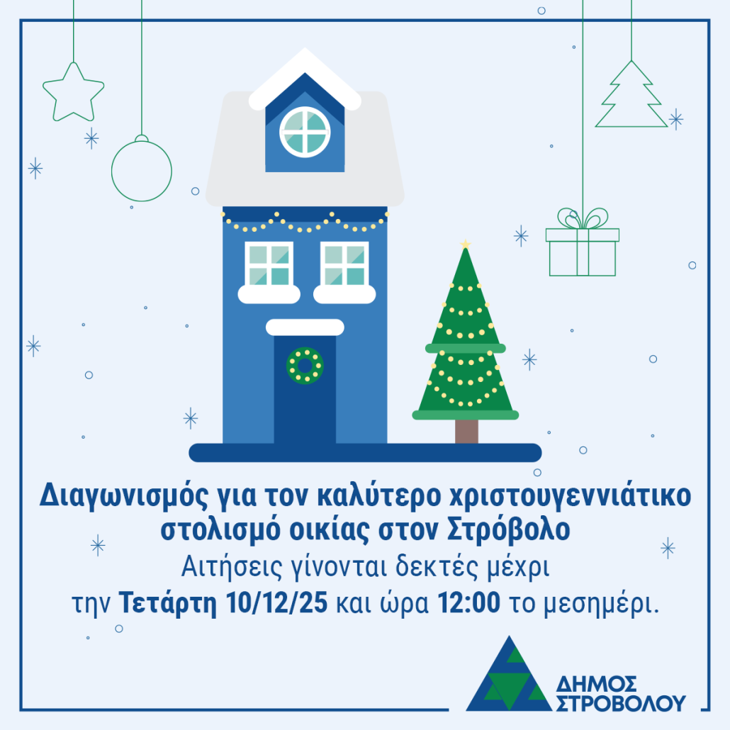 Ο Δήμος Στροβόλου ανακοινώνει τον διαγωνισμό για τον καλύτερο χριστουγεννιάτικο στολισμό οικίας με τρία βραβεία αξίας €100 έκαστο. Λήξη προθεσμίας διαγωνισμού 10/12/2025. Πληροφορίες και αίτηση συμμετοχής εδώ: