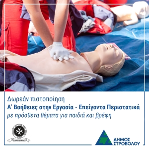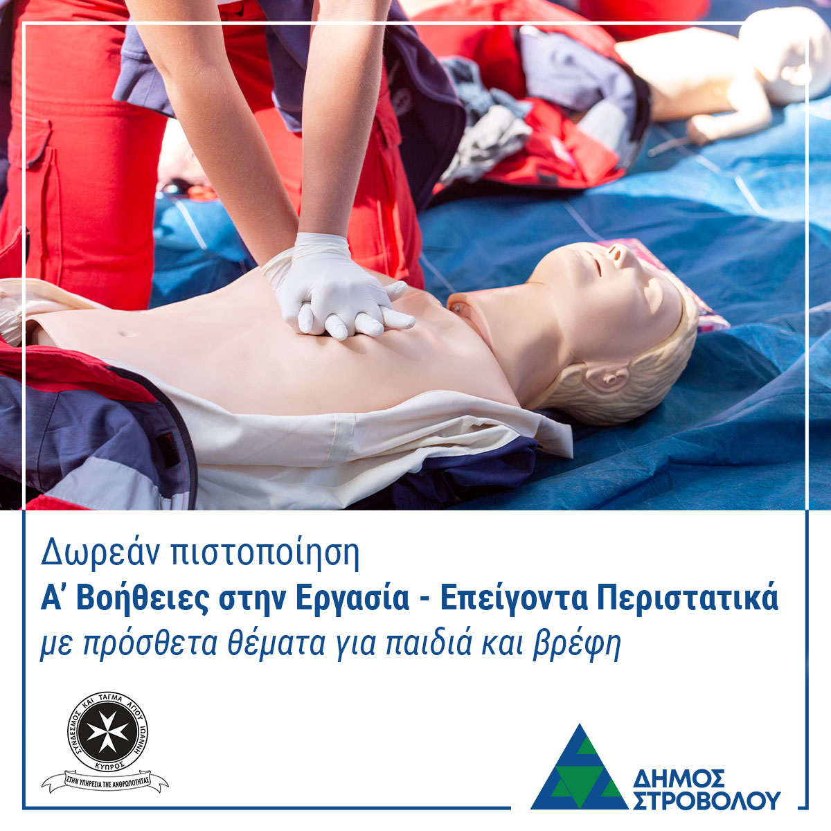 Ο Δήμος Στροβόλου παρέχει την ευκαιρία για δωρεάν πιστοποίηση στις Α’ Βοήθειες στην Εργασία- Επείγοντα Περιστατικά, με πρόσθετα θέματα για παιδιά και βρέφη.