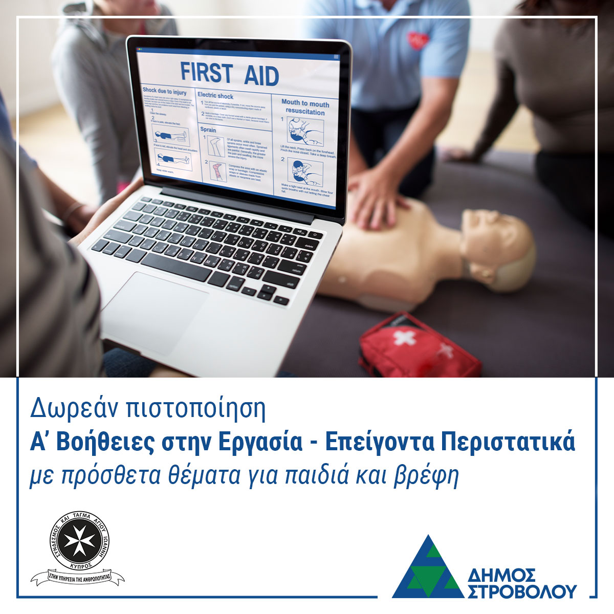 Ο Δήμος Στροβόλου παρέχει την ευκαιρία για δωρεάν πιστοποίηση στις Α’ Βοήθειες στην Εργασία- Επείγοντα Περιστατικά, με πρόσθετα θέματα για παιδιά και βρέφη.