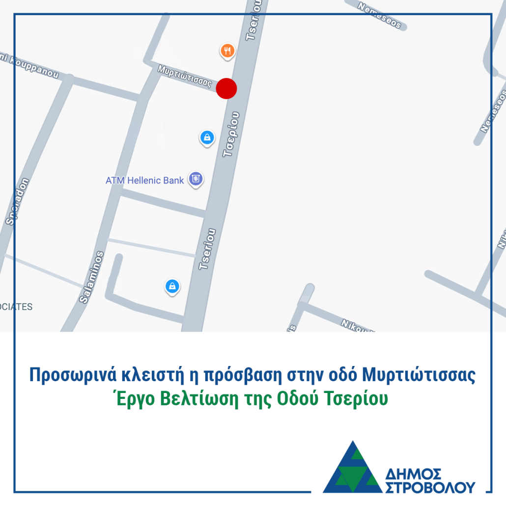 Ο Δήμος Στροβόλου ενημερώνει το κοινό ότι από την Παρασκευή 13 Φεβρουαρίου 2026 θα πραγματοποιούνται κατασκευαστικές εργασίες στην οδό Μυρτιώτισσας, στο πλαίσιο του έργου βελτίωσης της οδού Τσερίου.