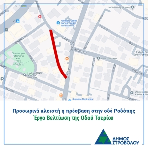 Ο Δήμος Στροβόλου ενημερώνει το κοινό ότι από την Παρασκευή 16 Ιανουαρίου 2026 θα πραγματοποιούνται κατασκευαστικές εργασίες στην οδό Ροδόπης, στο πλαίσιο του έργου βελτίωσης της οδού Τσερίου.