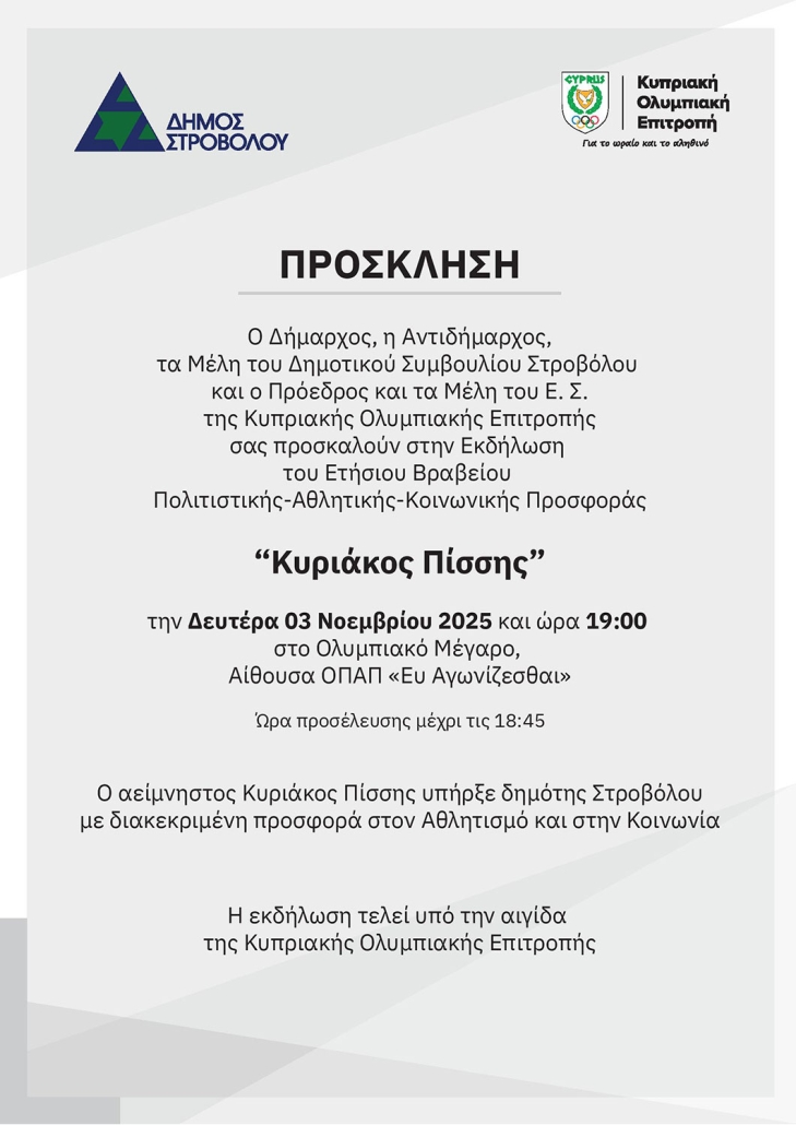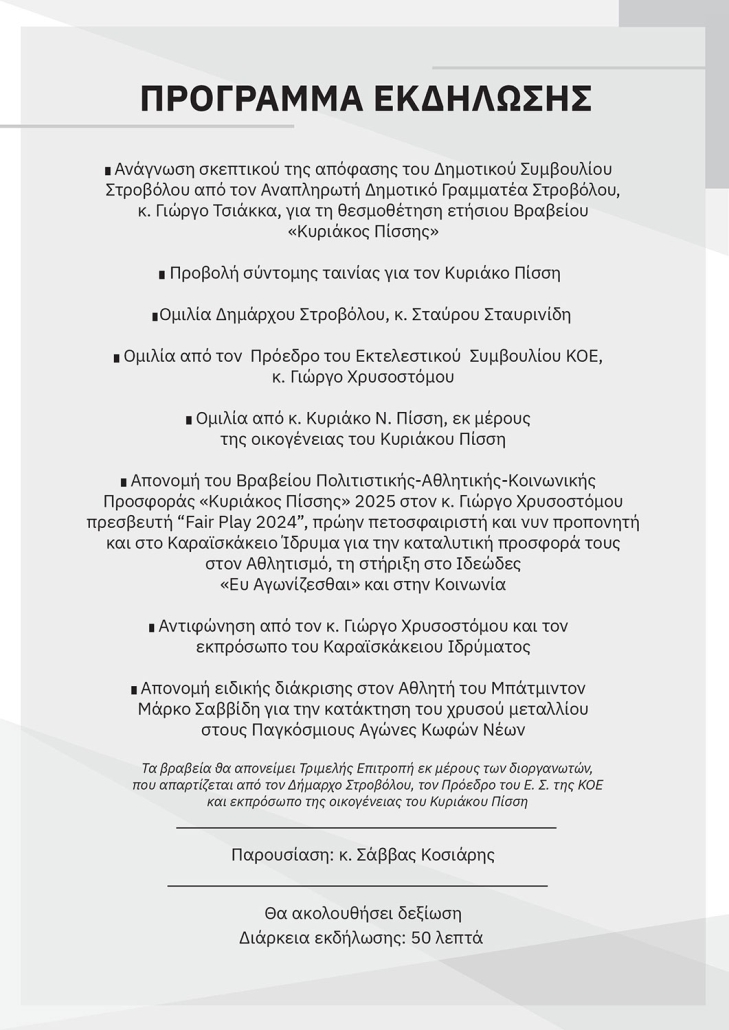 Εκδήλωση Προσφοράς Ετήσιου Βραβείου Πολιτιστικής – Αθλητικής – Κοινωνικής – Προσφοράς «Κυριάκος Πίσσης», 3/11/25
