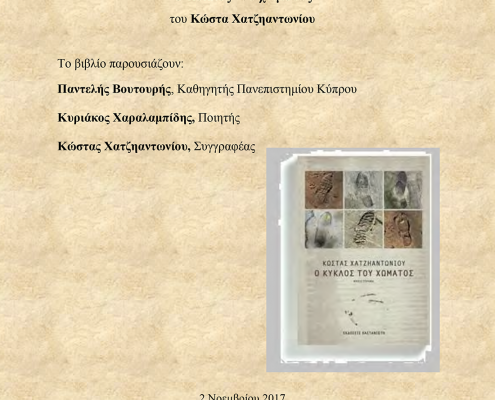 Λογοτεχνικές συναντήσεις της Πέμπτης: Παρουσίαση μυθιστορήματος «Ο Κύκλος του χώματος» του Κώστα Χατζηαντωνίου, 2/11/17, (19:45) – Πολιτιστικό Κέντρο Στροβόλου