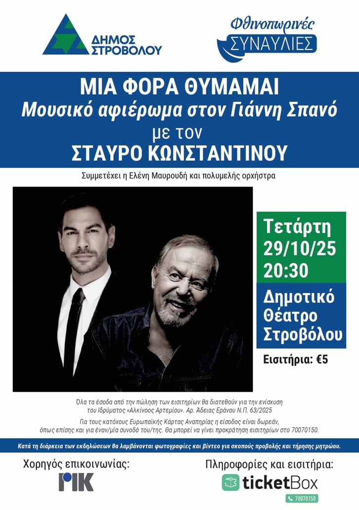 Η συναυλία θα πραγματοποιηθεί την Τετάρτη 29 Οκτωβρίου στις 20:30 στο Δημοτικό Θέατρο Στροβόλου. Συμμετέχει και η Ελένη Μαυρουδή και πολυμελής ορχήστρα.