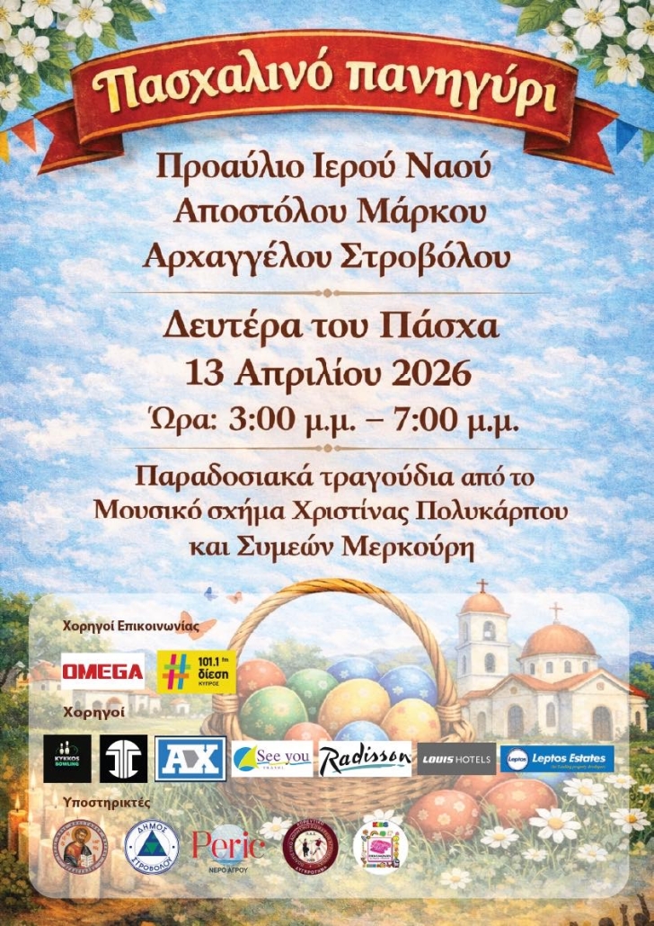 Πασχαλινό Πανηγύρι, Δευτέρα του Πάσχα 13/4/26 στο προαύλιο του Ιερού Ναού Απ. Μάρκου Αρχαγγέλου Στροβόλου