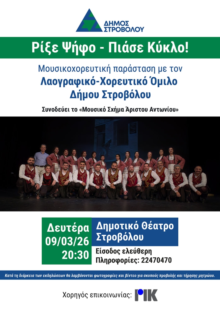 Ο Λαογραφικός – Χορευτικός Όμιλος του Δήμου Στροβόλου παρουσιάζει τη μουσικοχορευτική σατυρική παράσταση «Ρίξε Ψήφο – Πιάσε Κύκλο».