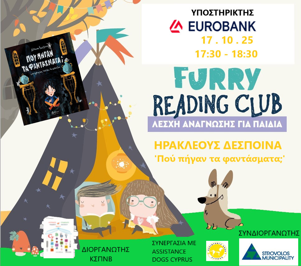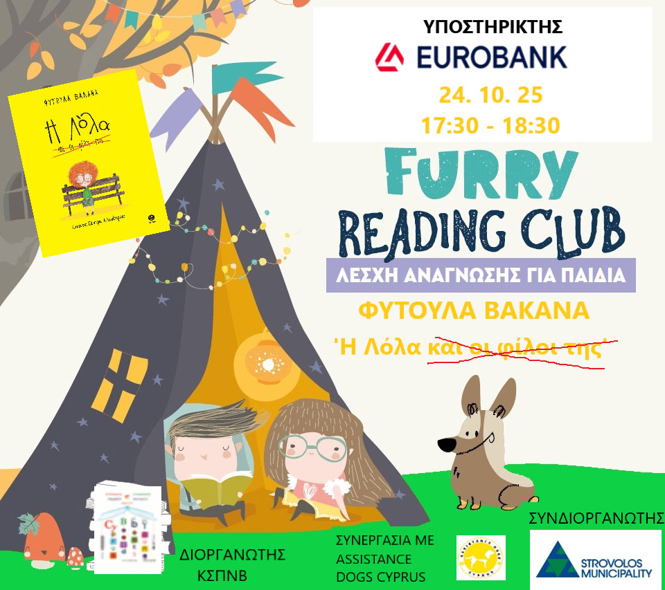 Ο Κυπριακός Σύνδεσμος Παιδικού και Νεανικού βιβλίου (ΚΣΠΝΒ), σε συνεργασία με το «Assistant Dogs Cyprus» και την υποστήριξη του Δήμου Στροβόλου, φέρνουν το επιτυχημένο πρόγραμμα «Furry Book Club – Reading Dogs», για παιδιά και εφήβους, στη Δημοτική Βιβλιοθήκη Στροβόλου!