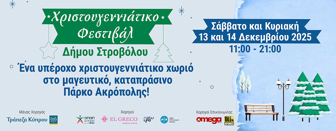 Δελτίο Τύπου Χριστουγεννιάτικο Φεστιβάλ Δήμου Στροβόλου στο Πάρκο Ακρόπολης στις 13 και 14 Δεκεμβρίου 2025 Ένα υπέροχο χριστουγεννιάτικο χωριό θα στηθεί στο μαγευτικό, καταπράσινο Πάρκο Ακρόπολης το Σαββατοκύριακο 13 […] |