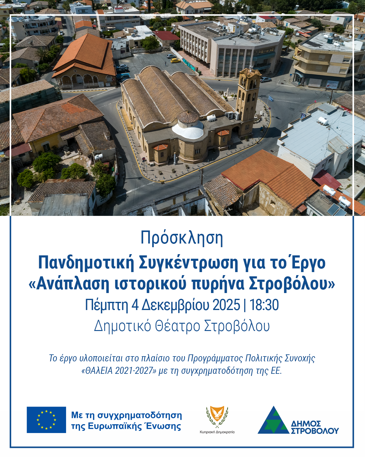 Ο Δήμαρχος, η Αντιδήμαρχος και το Δημοτικό Συμβούλιο Στροβόλου σας προσκαλούν σε Πανδημοτική Συγκέντρωση για το Έργο «Ανάπλαση ιστορικού πυρήνα Στροβόλου» που θα πραγματοποιηθεί την Πέμπτη 4 Δεκεμβρίου 2025 και ώρα 18:30 στο Δημοτικό Θέατρο Στροβόλου.