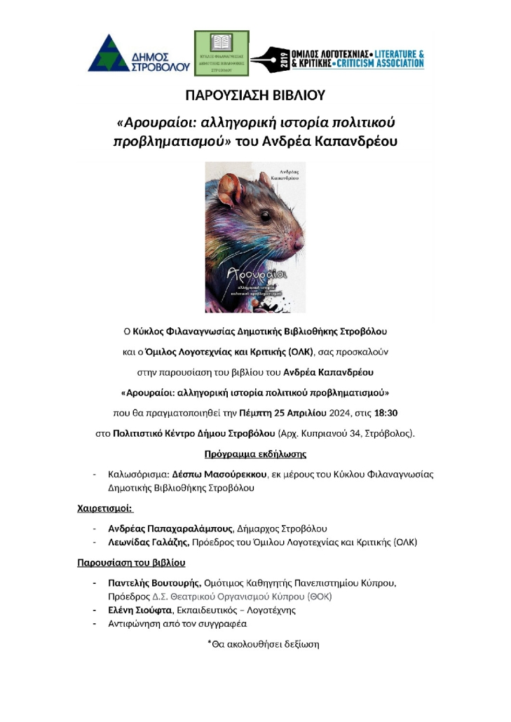 Είσαστε εδώ: Eκδηλώσεις στο Πολιτιστικό Κέντρο1 / Παρουσίαση βιβλίου του Ανδρέα Καπανδρέου «Αρουραίοι: αλληγορική ιστορία πολι...