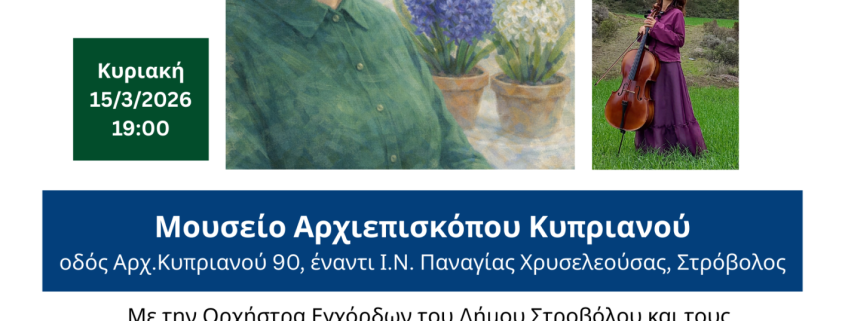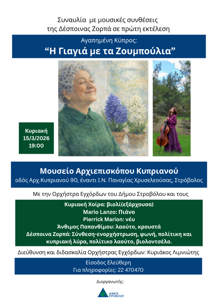 Ο Δήμος Στροβόλου παρουσιάζει την Κυριακή 15 Μαρτίου 2026 και ώρα 19:00, στο Μουσείο Αρχιεπισκόπου Κυπριανού (οδός Αρχ. Κυπριανού 90, έναντι Ι.Ν. Παναγίας Χρυσελεούσας, Στρόβολος), μια ξεχωριστή μουσική βραδιά με τίτλο «Αγαπημένη Κύπρος: Η Γιαγιά με τα Ζουμπούλια», με νέες συνθέσεις της Δέσποινας Ζορπά σε πρώτη εκτέλεση.