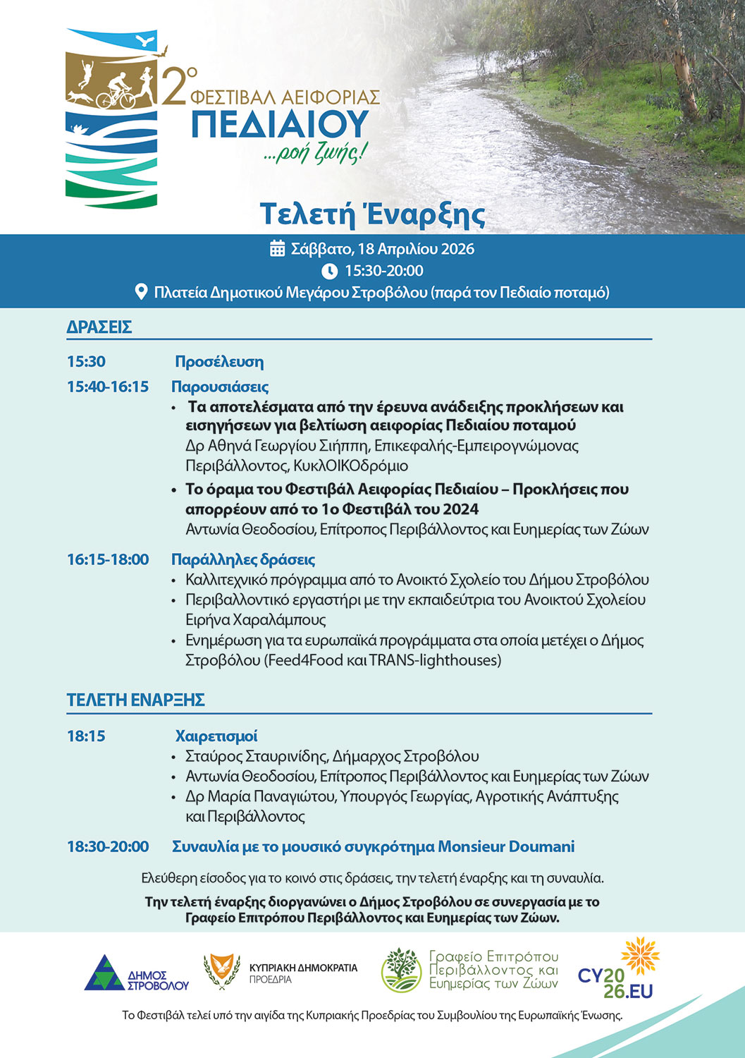 Είσαστε εδώ: Eκδηλώσεις - Δημοτικό Mέγαρο, Θέατρο, Πάρκα1 / Τελετή Έναρξης 2ου Φεστιβάλ Αειφορίας Πεδιαίου – Σάββατο 18/4/26...