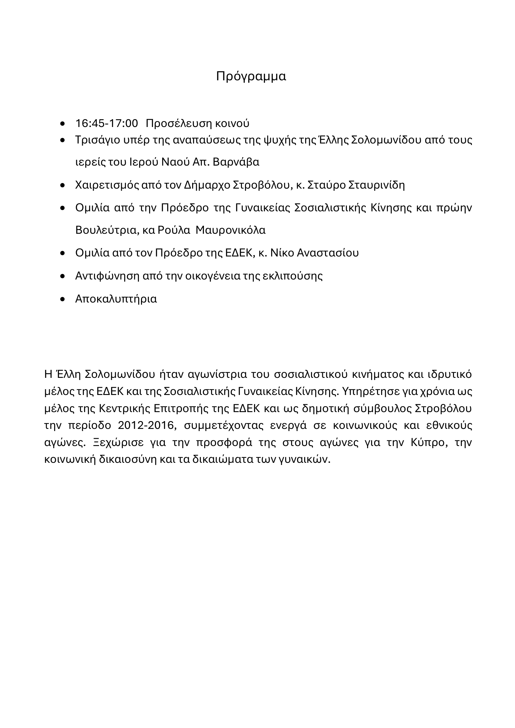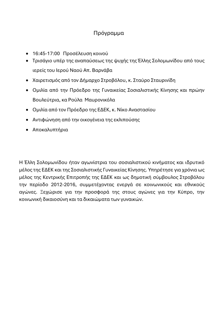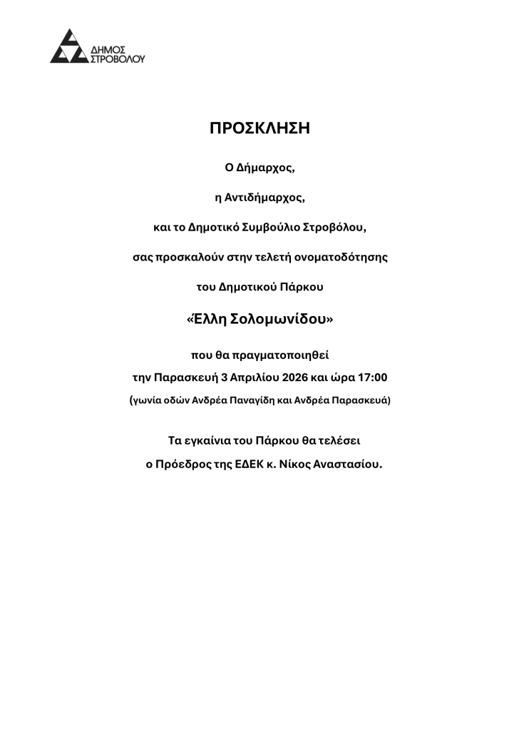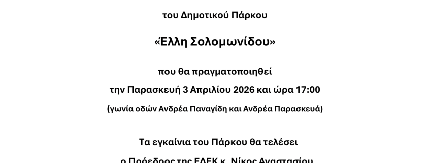 Τελετή ονοματοδότησης του Δημοτικού Πάρκου «Έλλη Σολομωνίδου», Παρασκευή, 3/4/26, 17:00, (γωνία οδών Ανδρέα Παναγίδη & Ανδρέα Παρασκευά)