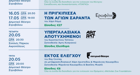 - «Η ΠΡΙΓΚΙΠΙΣΣΑ ΤΩΝ ΑΓΙΩΝ ΣΑΡΑΝΤΑ» του Χάρη Ρώμα, από τις Θεατρικές Επιχειρήσεις Ερωφίλη, Σάββατο 16 Μαΐου, 20:30 και Κυριακή 17 Μαΐου, 19:00 στο Δημοτικό Θέατρο Στροβόλου. Εισιτήρια εδώ: