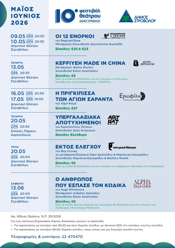 - «ΕΚΤΟΣ ΕΛΕΓΧΟΥ» του Ray Cooney, σε μετάφραση και διασκευή Χάρη Αριστείδου και Μαριάννας Καυκαρίδου, από το Σατιρικό Θέατρο, Τρίτη 26/5/2026, 20:00, Δημοτικό Θέατρο Στροβόλου. Εισιτήρια εδώ: https://www.ticketmaster.cy/showEventInformation.html?idEvent=7538